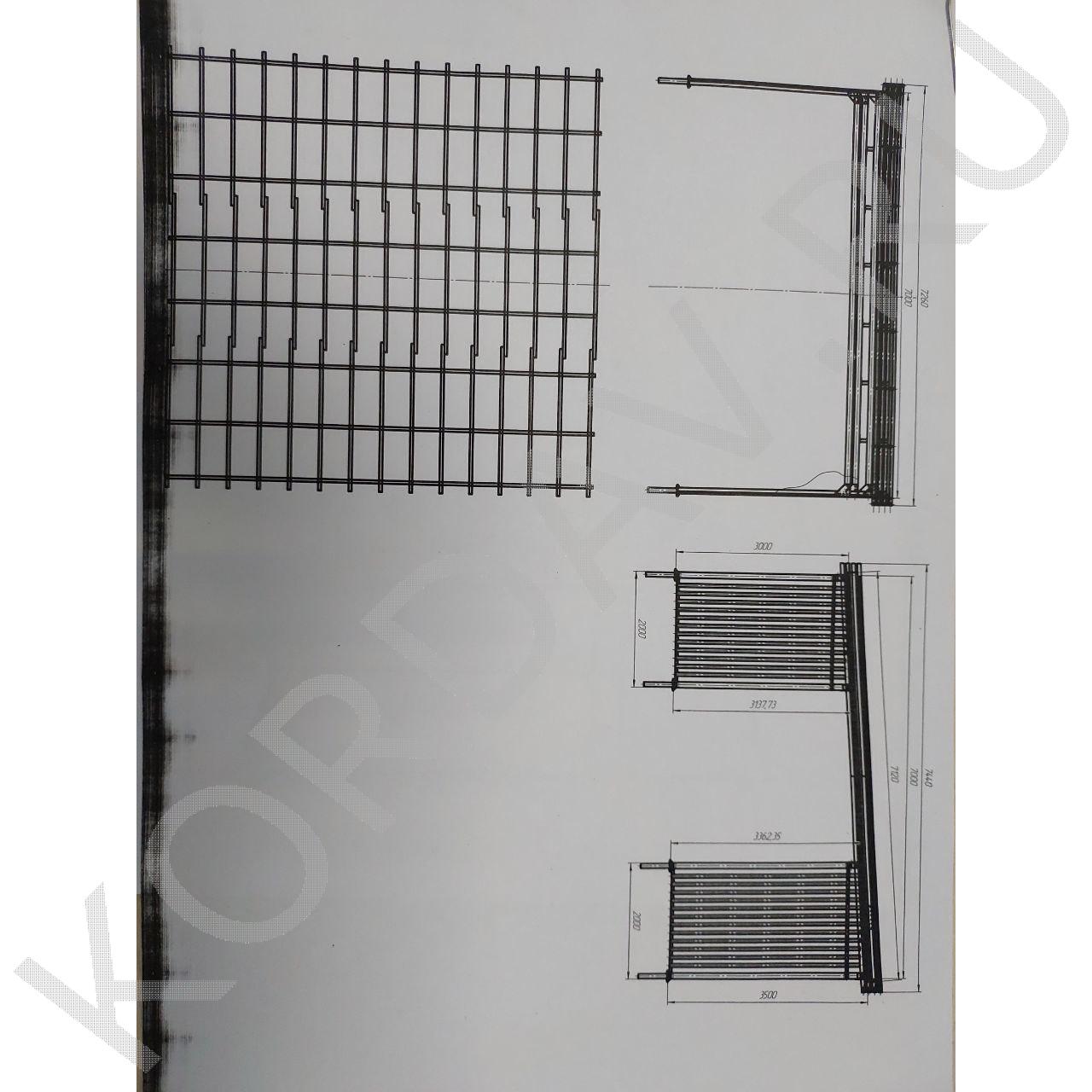 Боковые стороны навеса выполнены из прямоугольных стальных труб 60×40 мм, образующих вертикальные решётки размером 1800×2970×100 мм (высота × длина × глубина).